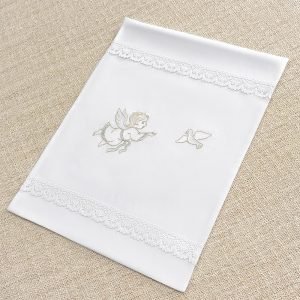 Изделие выполнено из искусственного шелка армани, украшено белым кружевом.